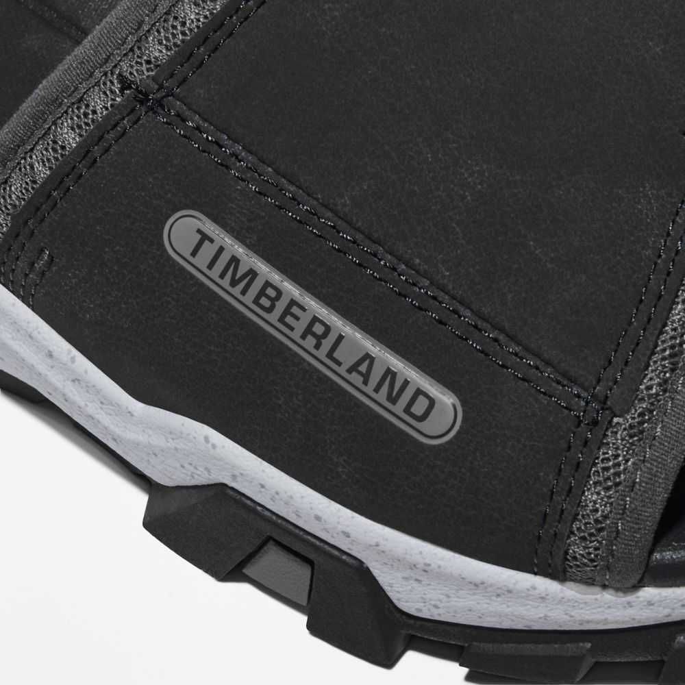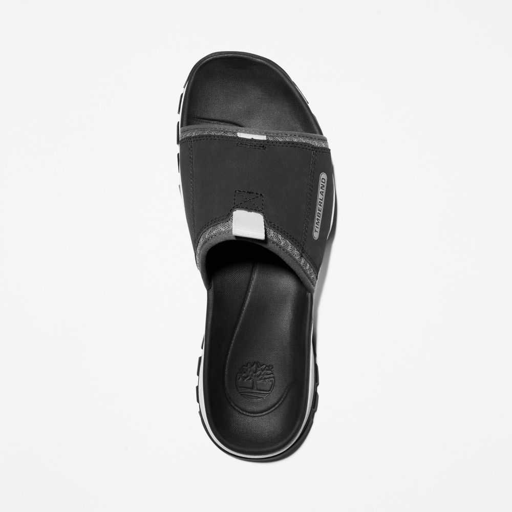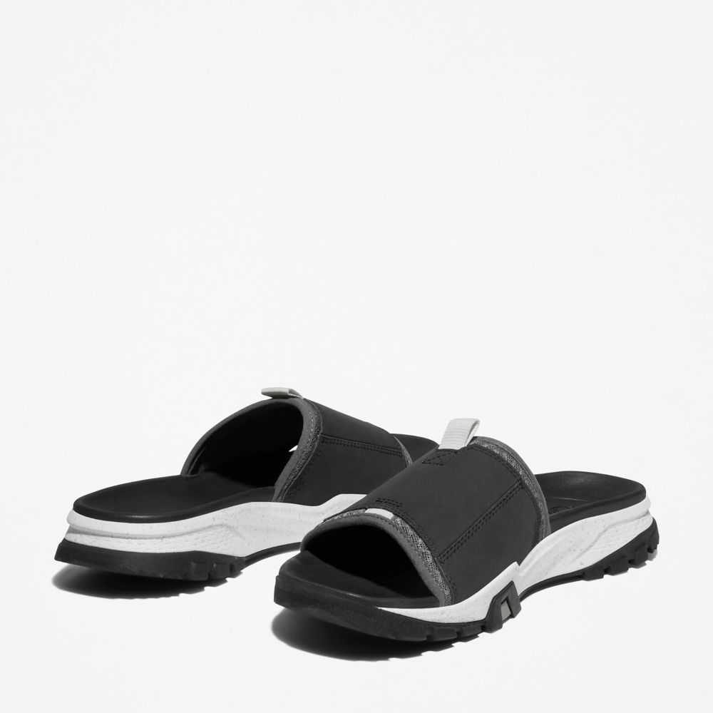 Our Garrison Trail men's slide sandals were designed for comfort,convenience,superior traction,and environmental responsibility.DETAILS • Upper: Better Leather from a tannery rated silver by the Leather Working Group for its water,energy,and waste management practices,and ReBOTL™ fabric containing at least 50% recycled plastic • ReBOTL™ fabric lining • Midsole of compression-molded EVA-blend foam for high-rebound cushioning • Rubber lug outsole with TimberGrip™ traction technology • EVA footbed • Imported